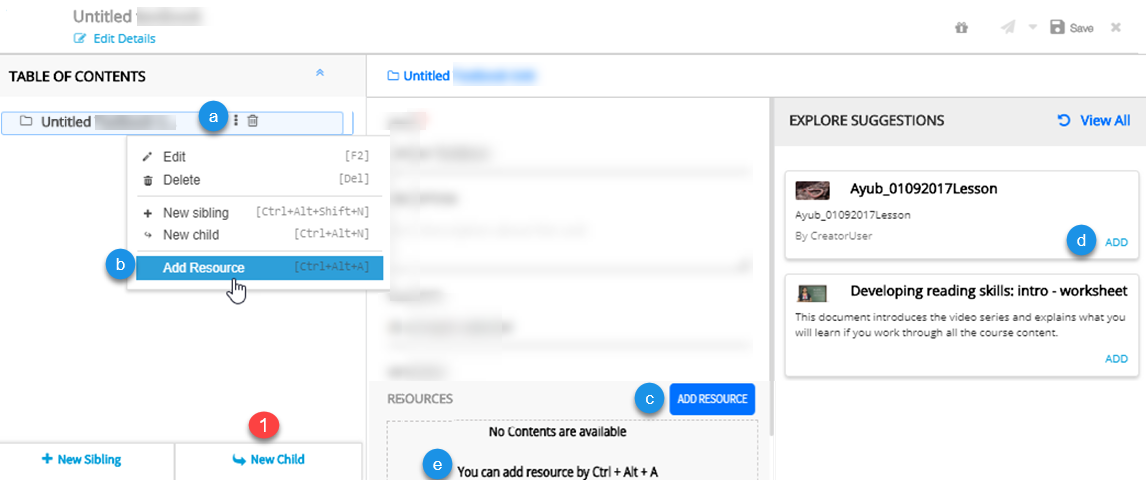 1. Click New Child a. Click Add Resource from the burger menu associated with the required node in the left pane, OR b. Right-click on the node and select Add Resource, OR c. Click Add Resources button in the action pane, OR d. Click Add on the resource card on the left pane Note: This option is exclusively meant for Book Creators e. Use the keyboard shortcut Ctrl+Alt+A For more details on keyboard shortcuts, refer Keyboard Shortcuts |