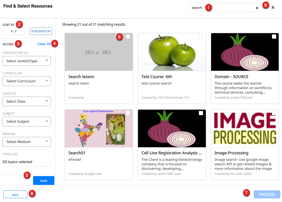 1. Type keywords to search for content Note: On entering three characters, you see content titles as suggestions 2. You can sort your search alphabetically or based on published date. Click Sort By and Published on 3. To apply filters, select from the drop-down lists available for: a. Content Type b. Curriculum c. Class d. Subject e. Medium f. Topics 4. Click Clear All to edit and reset the filters 5. Click Apply. Results are loaded on the right pane 6. Select the content you want to add 7. Click Proceed 8. Click Back to go back to the previous screen 9. Click Close icon to go back to the main menu |