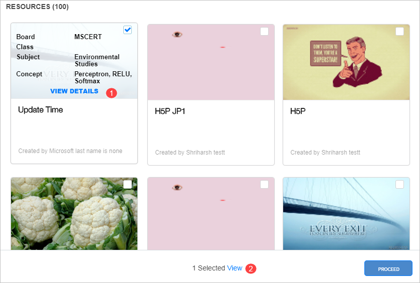 Note: You can add another course in the course. You can search for a course by its title or do-id. Hover over the resource card to view concise content details 1. Click View Details on the resource card to view all the details, OR 2. Click View to view all the details |