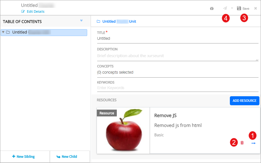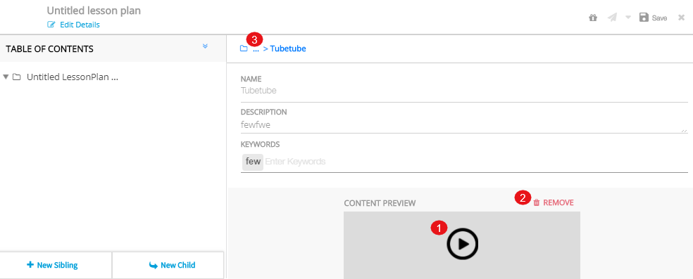 1. Click the Play icon to load the added resource 2. Click Remove icon to delete the content from the list 3. Click the link in the breadcrumb to visit the first level of the corresponding unit Click Save to save the changes |