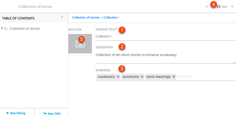 | 1. Enter Content Title 2. Enter Description 3. Enter Keywords 4. Click Save to save the metadata 5. Click Image icon to add image to the metadata. For details on the metadata, refer Adding Image to Metadata |