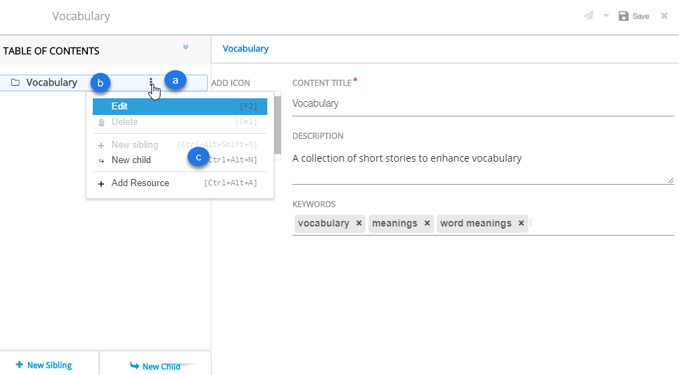 | 1. To add a child node, you can either a) Click New child from the burger menu &npsp;associated with the required node in the left navigation pane, OR b) Right-click on the node name and select New sibling, OR c) Use the keyboard shortcut Ctrl+Alt+N Note: The metadata for sibling and child nodes is the same. For details on the metadata, refer Node Metadata |