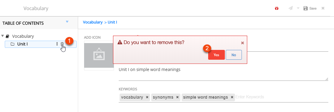 | 1. Click Delete icon on the burger menu associated with the node 2. Click Yes to delete the node Note: You can alternatively delete nodes by clicking Delete in the burger menu drop-down. If there is a child or siblings in the node, then they too are deleted. |