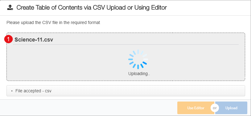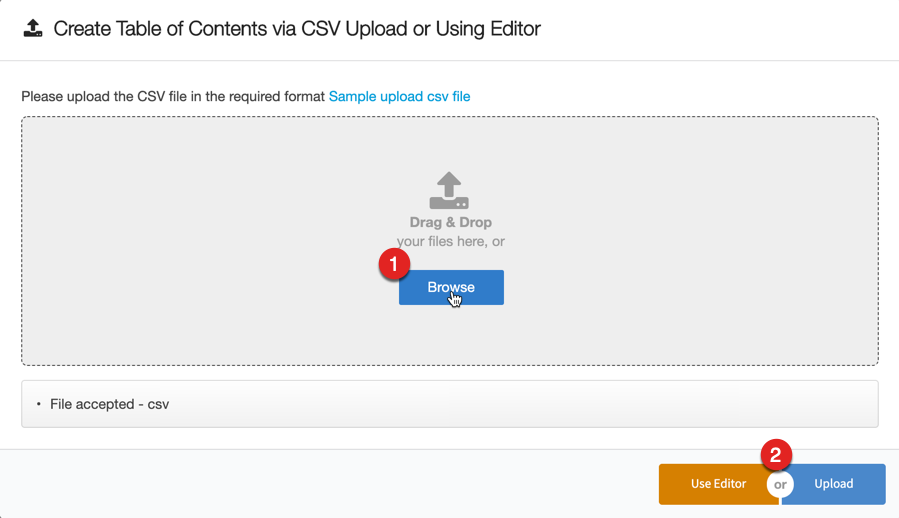 1. Click Browse to search for the csv file 2. Click Upload to upload the select file. You can alternatively click Use Editor to create the ToC manually |