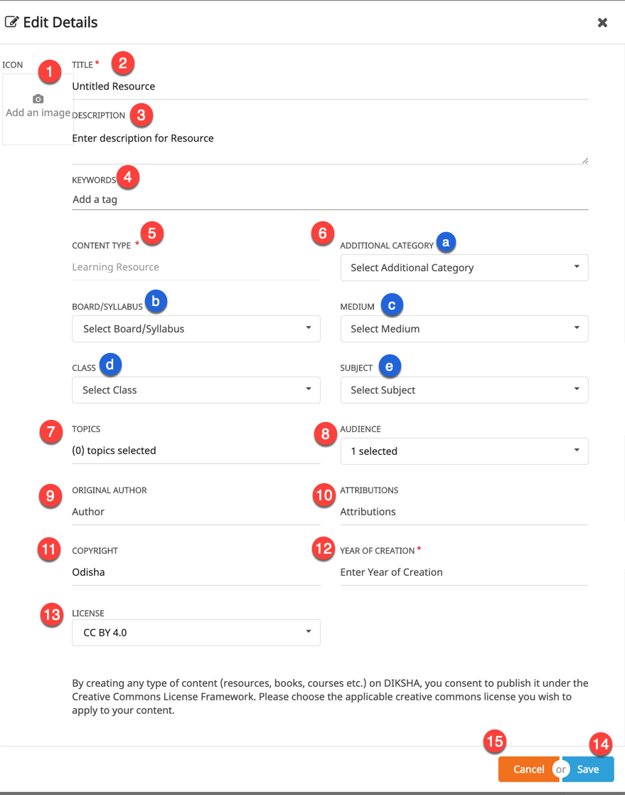 1. Click the camera icon to add an image Note: For details, refer Adding Image to Metadata 2. Enter Title 3. Enter Description for the resource 4. Enter Keywords 5. 5. The Collection Type is auto-filled based on the content type that is being created 6. Select the following from their respective drop-down lists: a. Additional Category b) Board c) Medium d) Class e) Subject 7. Enter Topic Note: To know more refer Selecting Topics 8. Enter Audience 9 Enter Original Author 10. Enter Attributions 11. Enter Copyright 12. Enter the Year of Creation 13. Select the License for the content from the drop-down list 14. Click Save to collectively save all updates 15. Click Cancel to exit the page Note: These details can also be added later when updating the resource details before sending it for review |