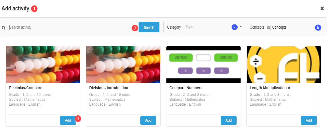 1. Filter the displayed list by selecting the: a) Category b) Concepts Note: You can choose to filter the list using more than one category and concept 2. Alternatively, you can search for activities by entering key words 3. Select the activity and click ADD |