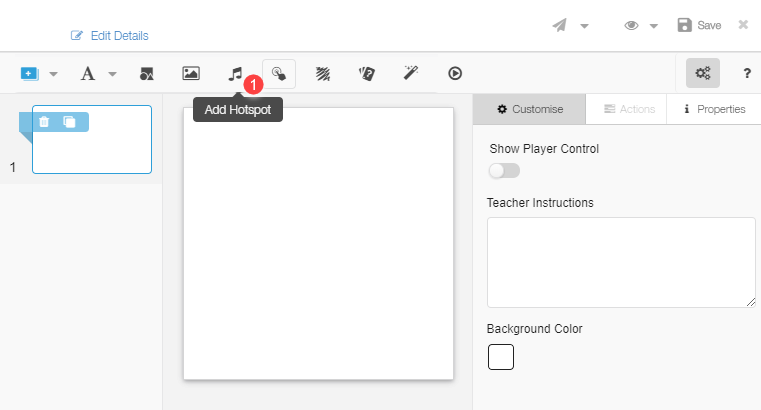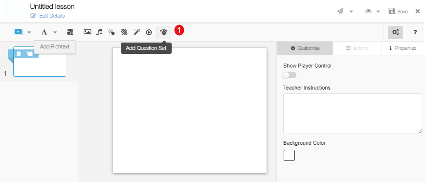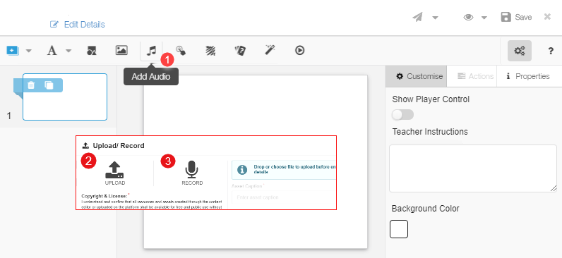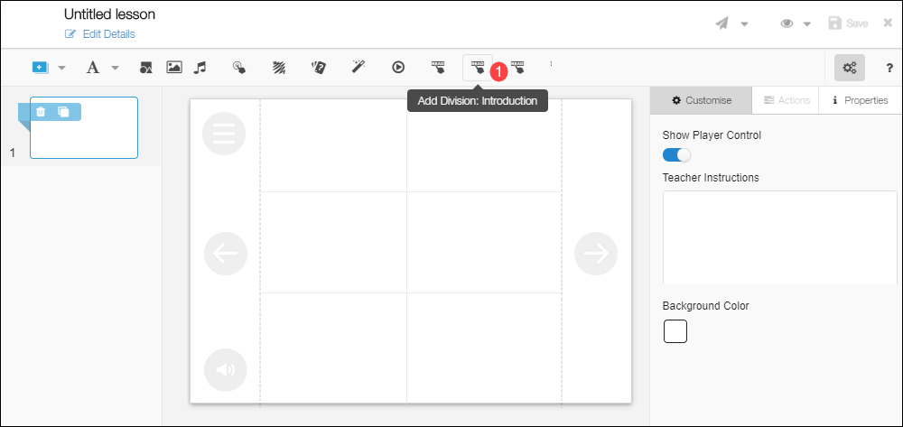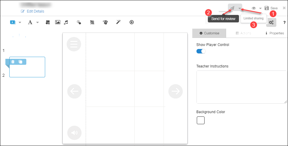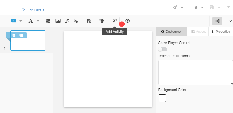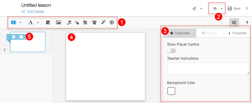 | 1. Show Player Control: A slider button that allows you to view or hide grid lines and the position of player control buttons. This button is not enabled by default. Enabling this option helps you effectively visualize your slide composition 2. Teacher Instructions: A pane to enter notes or instructions to teachers, about the slide content 3. Background Color: Select the background color of the slide from color bar. The default background color is white. |