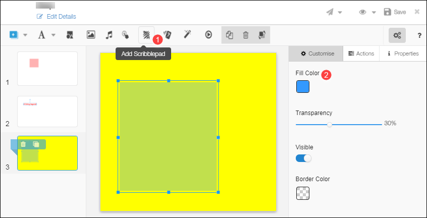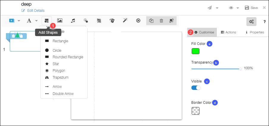 | 1. To add shapes, click the Add Shapes icon on the toolbar 2. The customize tab displays options to add features to the shapes. You can: a) Click Fill Color to add or modify the color of the shape b) Use the Transparency slider to modify the transparency level of the shape c) Use the Visible slider to make the selected shape visible or invisible d) Click Border Color to modify the color of the shape outline |
