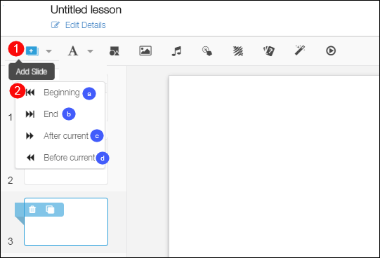 | 1. To add slides, click the Add Slide icon 2. Click to add a slide either in the: a) Beginning: as the first slide b) End: as the last slide c) After Current: after the current slide d) Before Current: before the current slide Note: Drag and drop slides in the left page to reorder them |