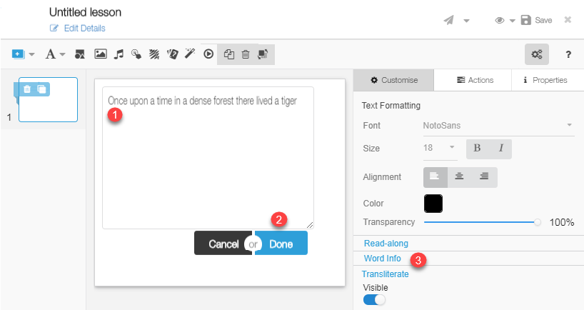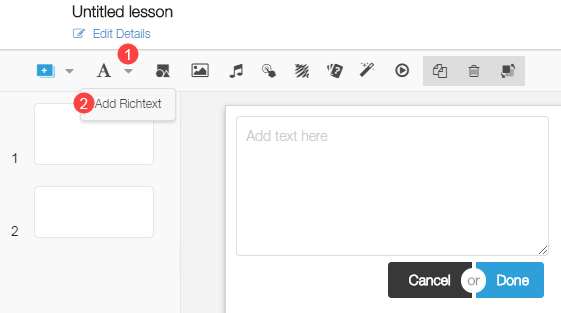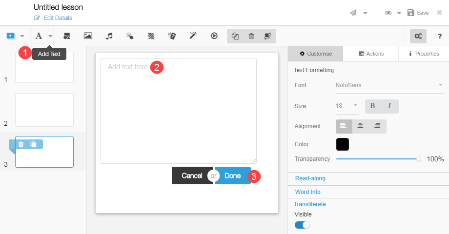 | 1. Type text into the text box and use the Rich text editor for customizing and styling the text. The richtext formatting feature allows you to modify: 2. Click Add To Lesson to add richtext styles 3. Click Cancel button, to cancel the text formatting 4. Click Close icon, to exit the page
