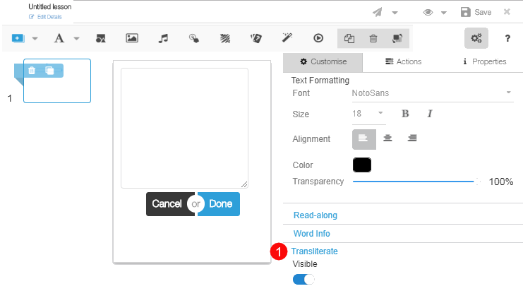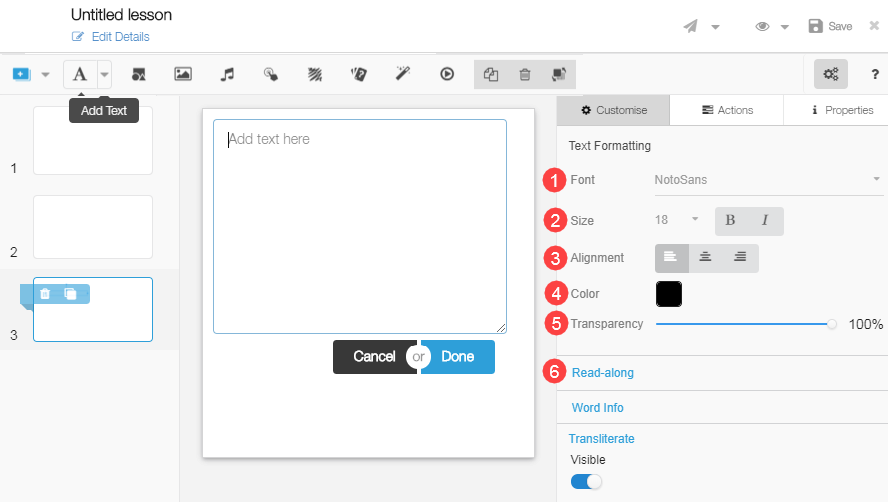 | On clicking Add text, the customize tab displays options to add features to the text. The Text Formatting feature allows you to modify: 1. Font: Pick a new font for your text 2. Size: Change font size 3. Alignment: Align text to the left, right or center of the text box 4. Color: Change color of your text 5. Transparency: Change the transparency of your text in relation to the background of the text box 6. The Read along feature on the customize tab allows you to add audio to the text on the slide. This is a useful feature to learn pronunciation, enhance vocabulary, etc. |
