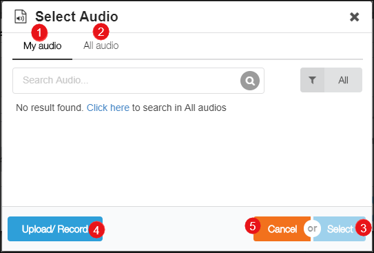 | 1. To add audio, click the Add Audio icon on the toolbar. The Upload/Record page appears