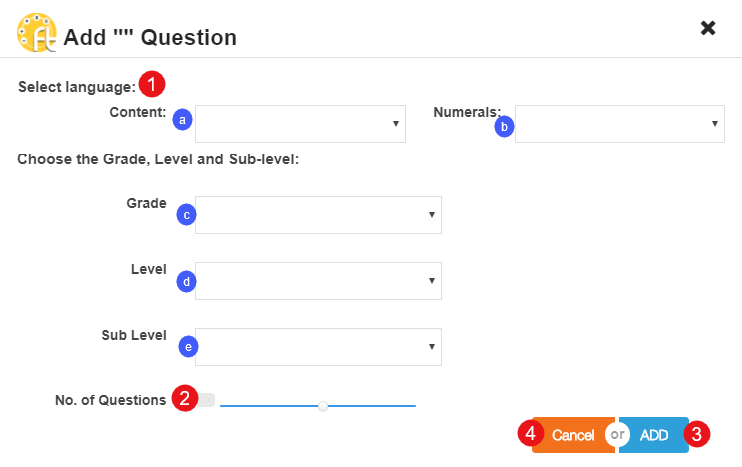 | 1. Select the following from their respective drop-down menus: a. Content b. Numerals c. Grade d. Level e. Sub Level 2. Determine the No. of Questions 3. Click Add 4. Click Cancel to go back to previous page |