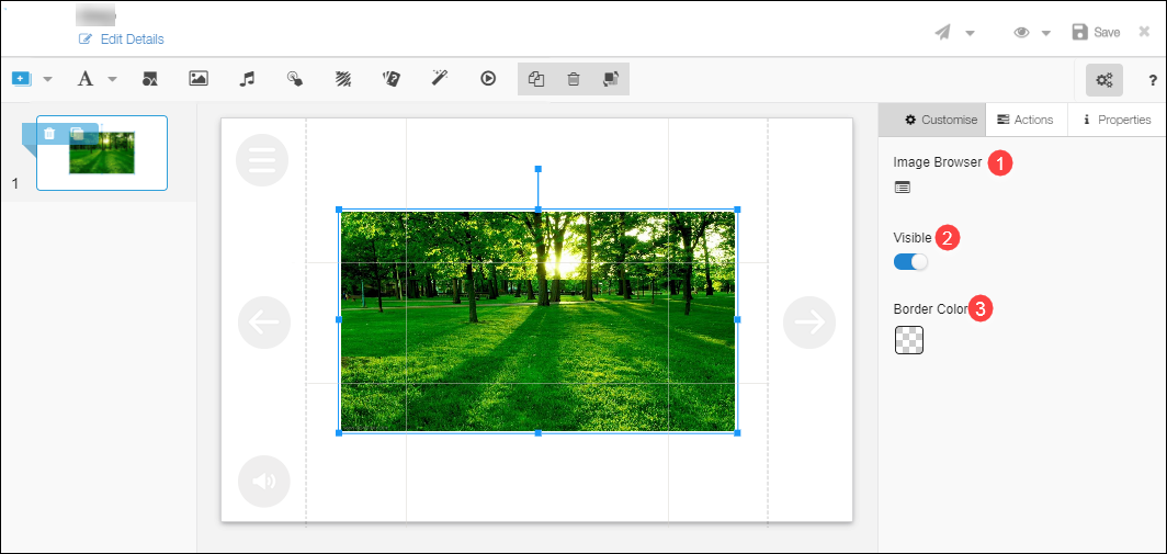 | After selecting and adding an image to the slide, the customize tab displays options to add features to the shapes. You can: 1. Click Image Browser to browse for images and select another image 2. Use the Visible slider to make the selected image visible or invisible 3. Click Border Color to modify the color of the shape outline |