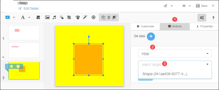 | 1. Click the Action tab on the right pane 2. Select an interaction from the drop-down menu 3. Select the target object to attach the action from the drop-down menu |