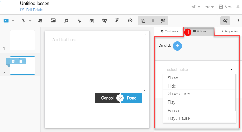 | 1. Actions enables you to add, modify or delete actions to animate objects on the slide. Ensure that you select a target object before you attach an action to it |