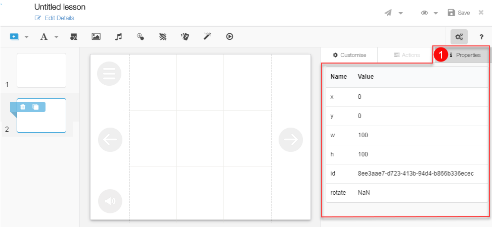 | 1. Properties enables you to view information that the editor automatically adds about the slide and the objects on the slide |