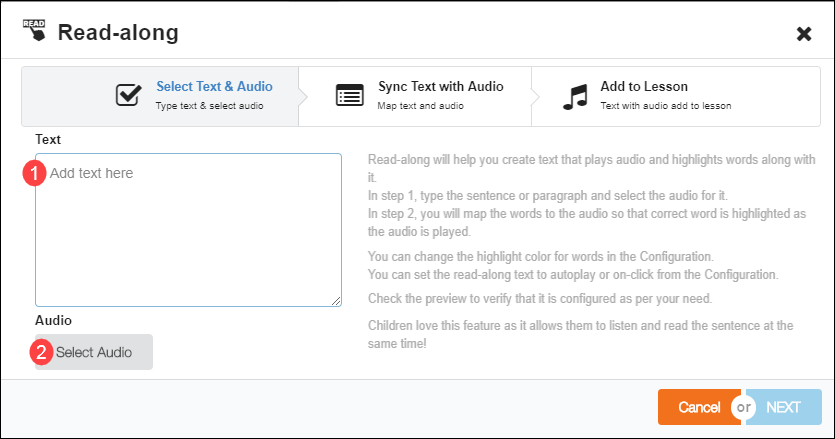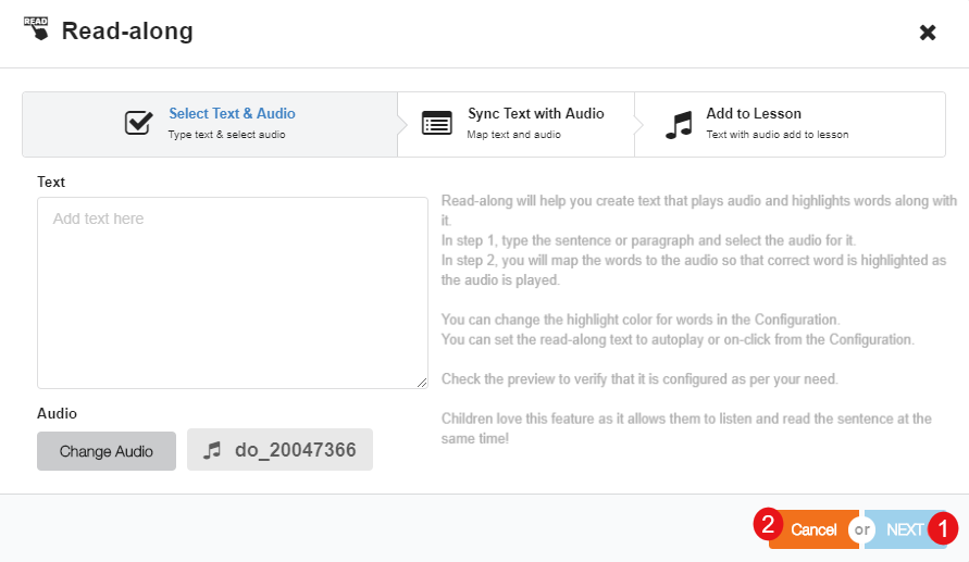 Note: For detailed instructions to add audio, refer to section Select Audio for Read Along Text 2. Click Upload to upload an audio 3. Click Record to record audio |