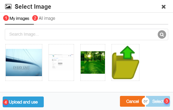 | You can add images either by selecting an image from a list or uploading images from your local machine to use immediately 1. Click My images to view a list of all image files that you have previously uploaded 2. Click All image to view a list of image files from the repository Note: The repository contains all image files added and uploaded by any users 3. Choose an appropriate image file from any list and click Select 4. Click Upload and use to upload and use images from your gallery |