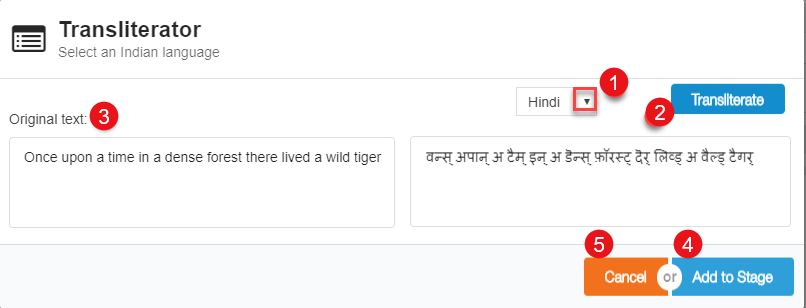 | Language Transliteration Tool 1. Select the language from the drop down list 2. Click Transliterate 3. The original text is displayed in the textbox on the left and the transliterated text is displayed in the textbox on the right 4. Click Add to Stage to add the transliterated text to the slide 5. Click Cancel to go back to previous page |