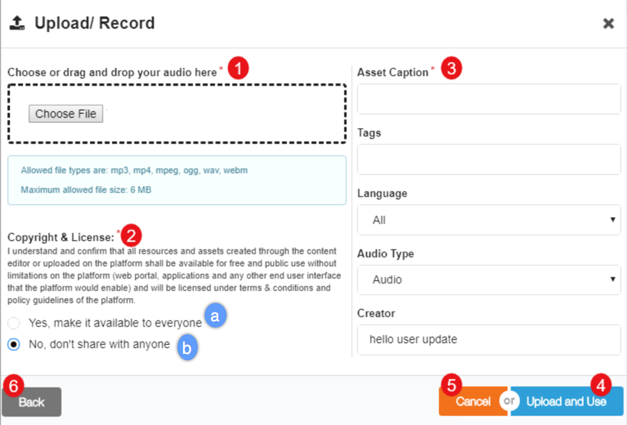 Note: Supported file formats are: .mp3, .mp4 2. Under Copyright & License, select if you want to: a) Make it available to everyone b) Not share with anyone 3. Add audio file details in the Asset Caption area 4. Click Upload and Use to upload the audio file 5. Click Cancel to abort uploading audio 6. Click Back to go to the previous screen |