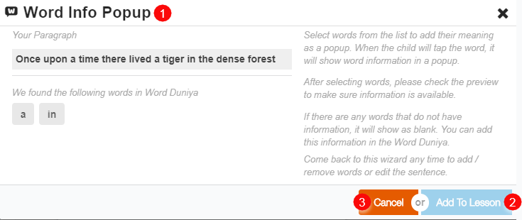 | 1. Word Info Popup page appears 2. Click Add to Lesson button to add words with the meaning 3. Click Cancel button to exit the page |