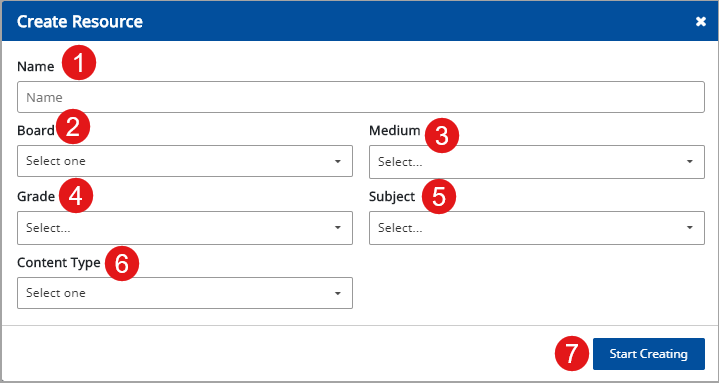 2. Enter Board 3. Enter Grade 4. Enter Medium 5. Enter Subject 6. Enter Resource Type 7. Click Start Creating |