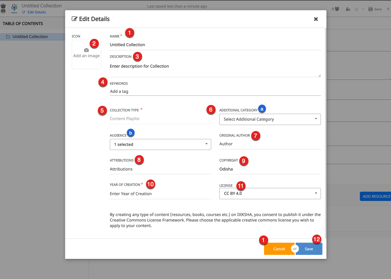 | Once you click the Send for review icon, the Edit details window is displayed 1. Enter a Title for the uploaded content 1. Click the Image icon to upload an image for the content. For details on adding image, refer Adding Image to Metadata 2. Enter a Description for the content 3. Enter Keywords to enhance the searchability of the content Note: Keywords help search engines to find content associated with it during a search 4. The Collection Type is auto-filled based on the content type that is being created 5. Select the following from their respective drop-down lists: a. Additional Category b. Audience 6. Enter Audience 7. Enter Original Author 8. Enter Attributions 9. Enter Copyright 10. Enter the Year of Creation 11. Select the License for the content from the drop-down list 12. Click Save 13. Click Cancel to exit the page |