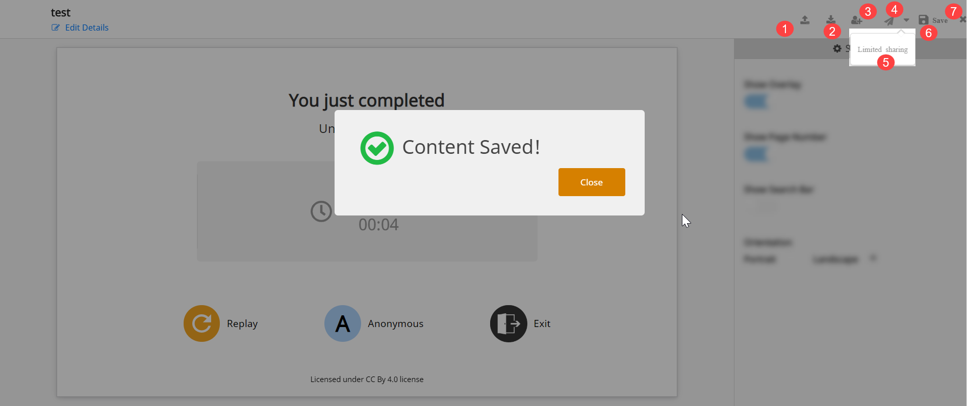 | 1. Click Upload icon to upload some other additional content to the same editor if required 2. Click Download icon to download the content 3. Click Add Collaborator to add collaborator for the content curation 4. Click the Send Review icon to send the content for review 5. Click the Limited Sharing icon to share the content with a limited audience before publishing the content If you click the drop-down icon beside the Send for Review icon, the Limited Sharing option is displayed 6. Click Save to save the uploaded content 7. Click Exit to exit from the screen |