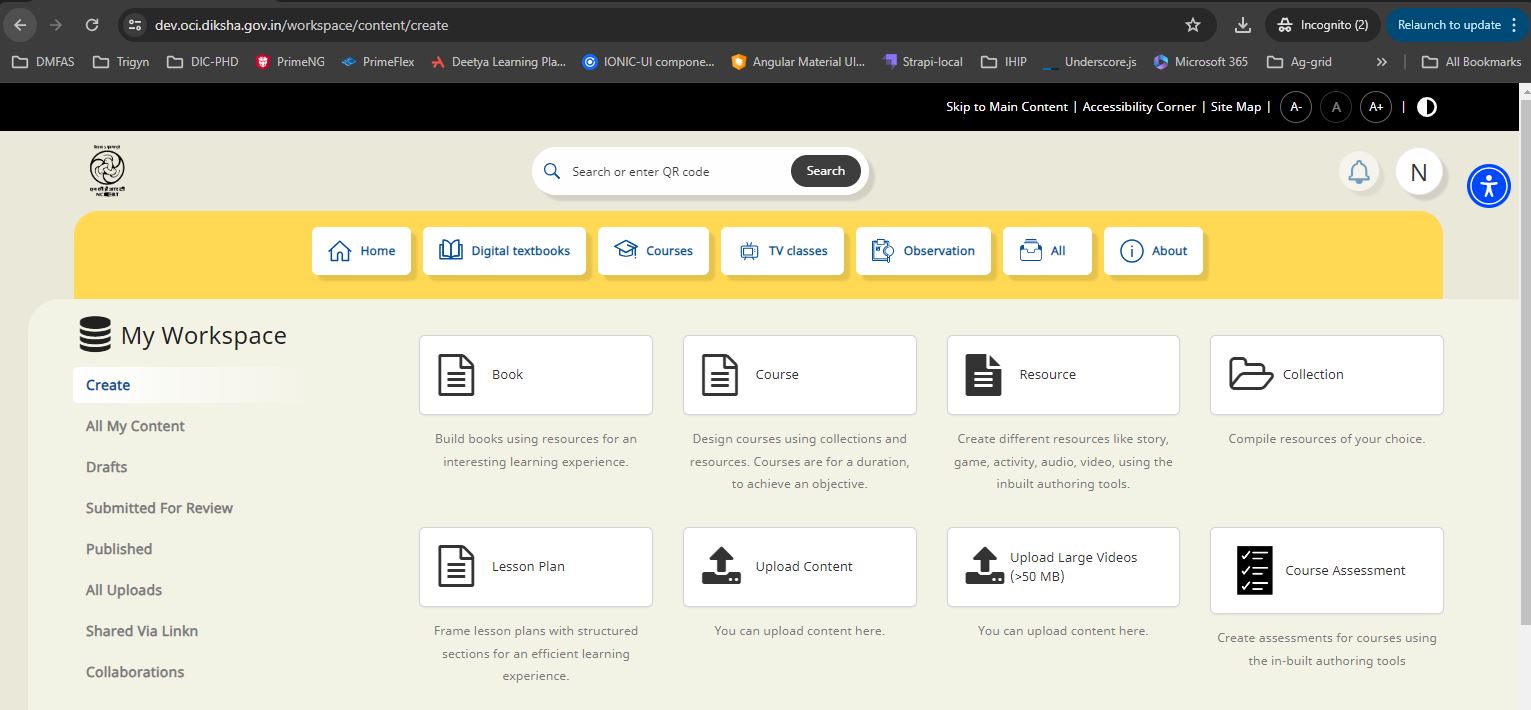 | 1. Log in to DIKSHA portal using your content creator credential 2. Click Create 3. Click Upload Content |