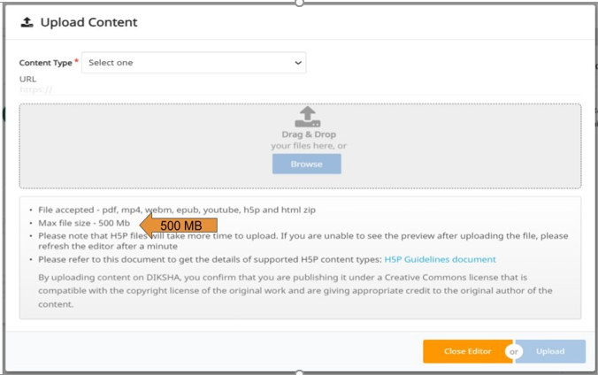 A content creator may create content without using DIKSHA Content creation platform. They can create and save those content on their system (laptop, desktop, etc). They can upload the content which are saved on their local using Upload Content feature of the DIKSHA portal. DIKSHA supports the following content formats:
