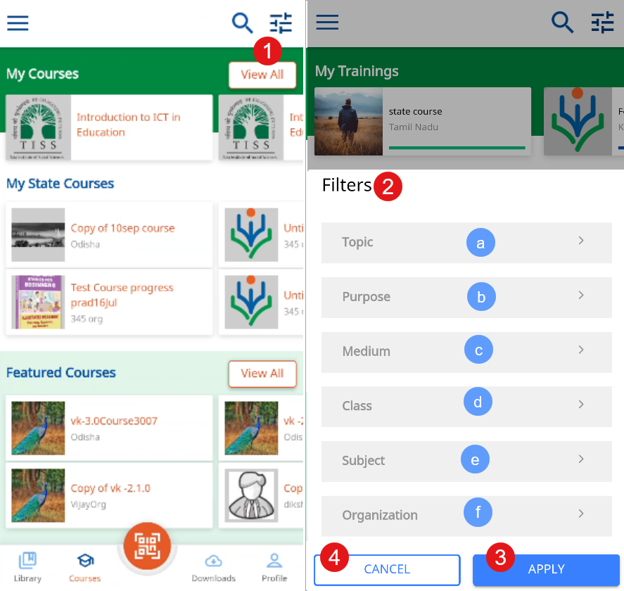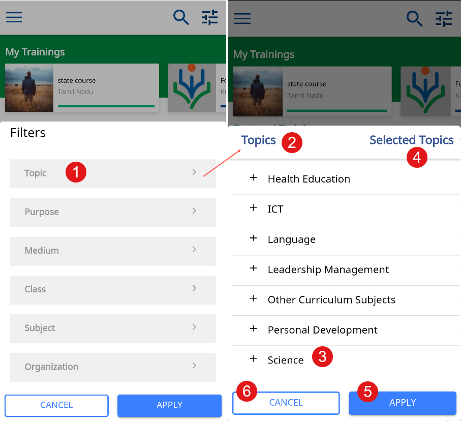 1. Tap the Filter icon on the Courses screen 2. Select one or more options from the following filter options: a. Topic For details refer Searching with Topics b. Purpose c. Medium d. Class e. Subject f. Organization 3. Tap APPLY to apply the filters 4. Tap CANCEL to exit the screen |