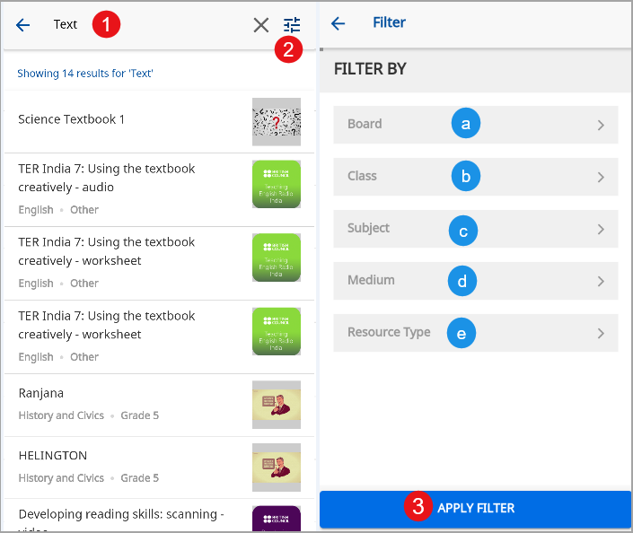 1. Enter the relevant text in the search textbox. The search results are displayed here 2. Tap Filter button and refine the search result on the basis of a. Board b. Class c. Subject d. Medium e. Resource Type 3. Tap APPLY FILTER to refine the search results |