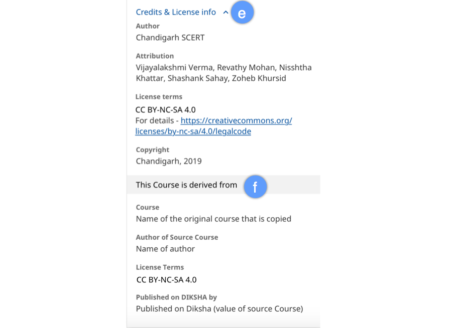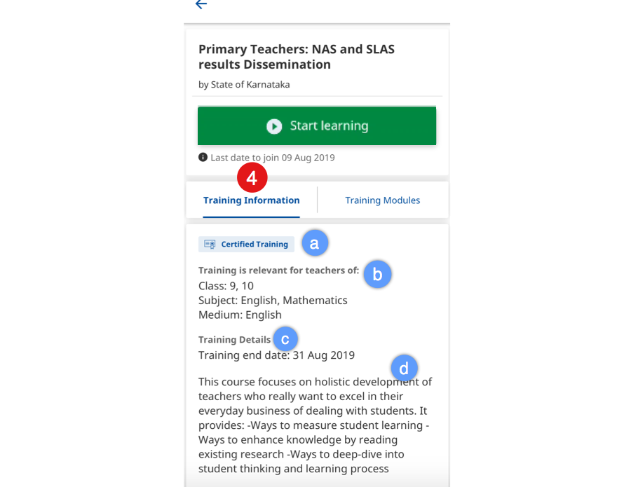 a. Certified Course. This information is present only for the courses that are certified b. Course is relevant for teachers of Class, Subject, and Medium c. Course details d. Course description |