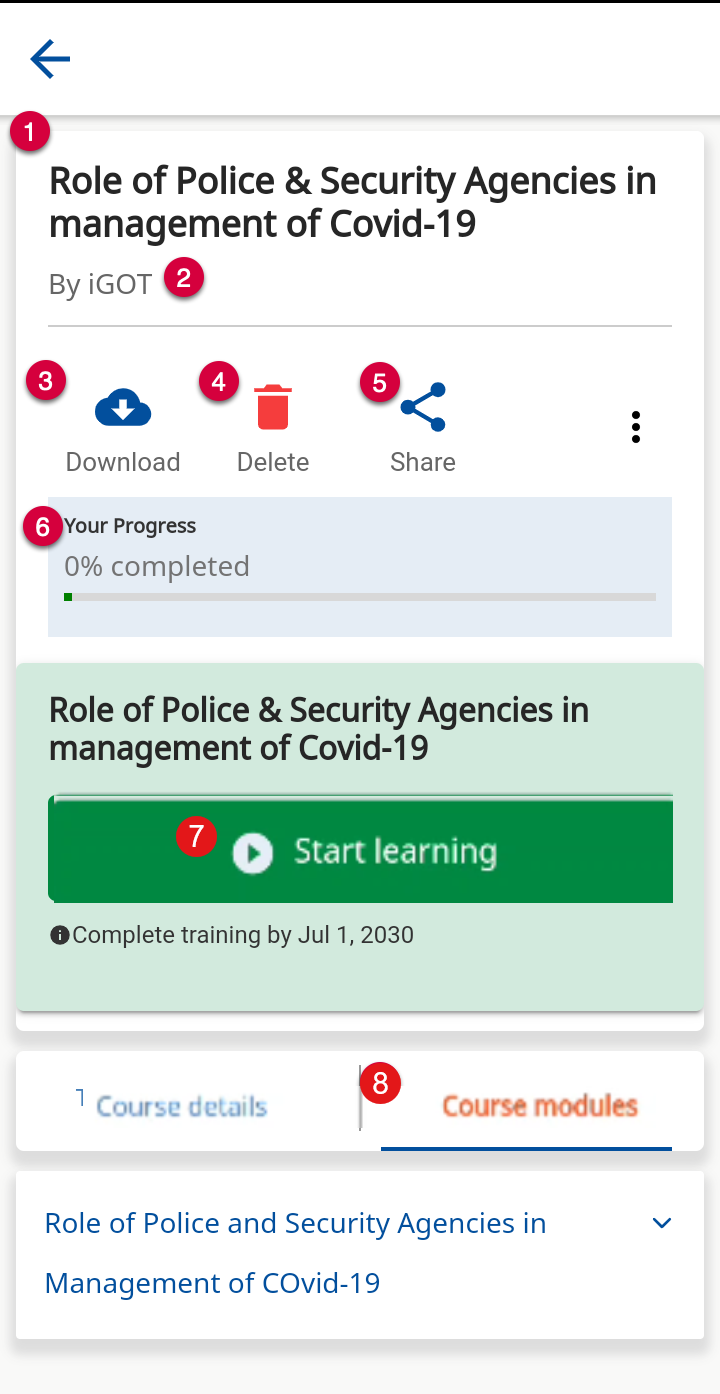 2. Name of the course creator 3. Click download icon to download the course 4. Click delete icon to delete this course from the list of courses 5. Click share icon to share this course with others 6. The progress bar tracks the user's progress in completing the course 7. Tap Start Learning to join in the course 8. Tap Course Modules to view the different modules in the course |