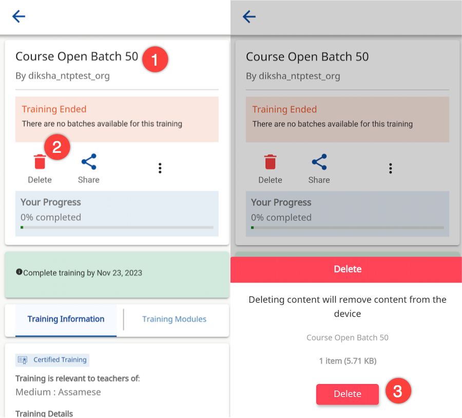 1. Tap the course card under My Courses section 2. Tap Delete icon. A Delete pop up is displayed 3. Tap Delete The content will be deleted from your device storage |