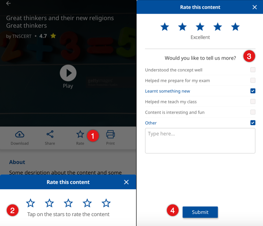 A Rate Content pop up appears where you can rate the course 2. Use the Star icons to rate 3. Provide your feedback in the Feedback field Adding comments as feedback is optional 4. Tap Submit to submit your rating and feedback Note: Rating option is not available for all kind of content apart from HTML content |