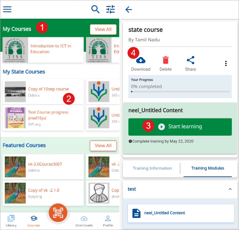 • My State Courses: This category displays the list of State-specific course that is created and uploaded by the user’s State. This list is visible only to users registered in that specific State. If you log in as an authenticated State user, you can join the course for any batch that is open for enrolment. The list displays the most recently created course at the top.