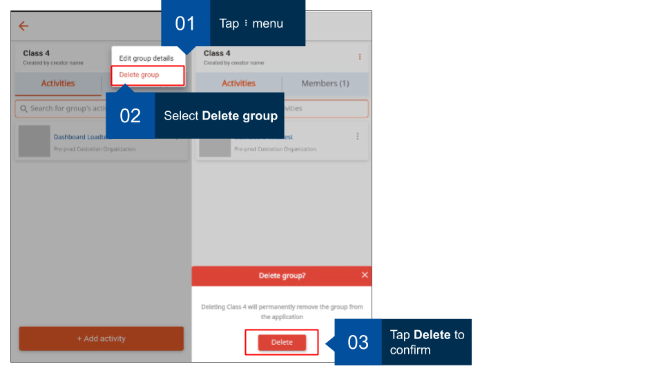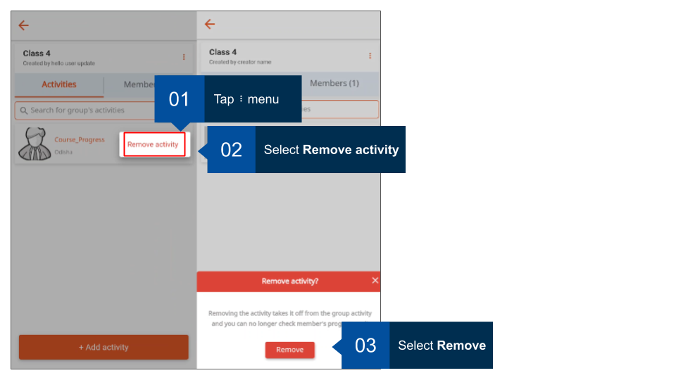 Group administrators can remove any activity that has been added for the group.