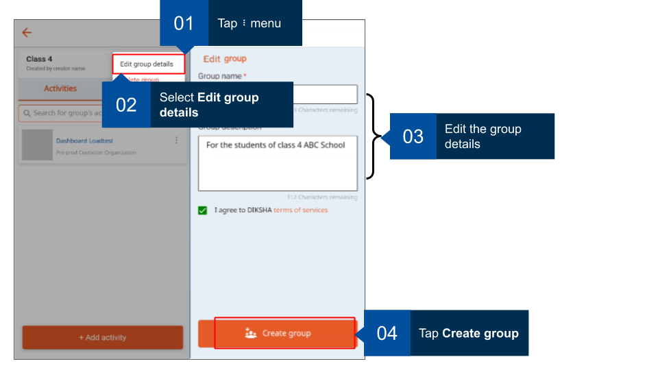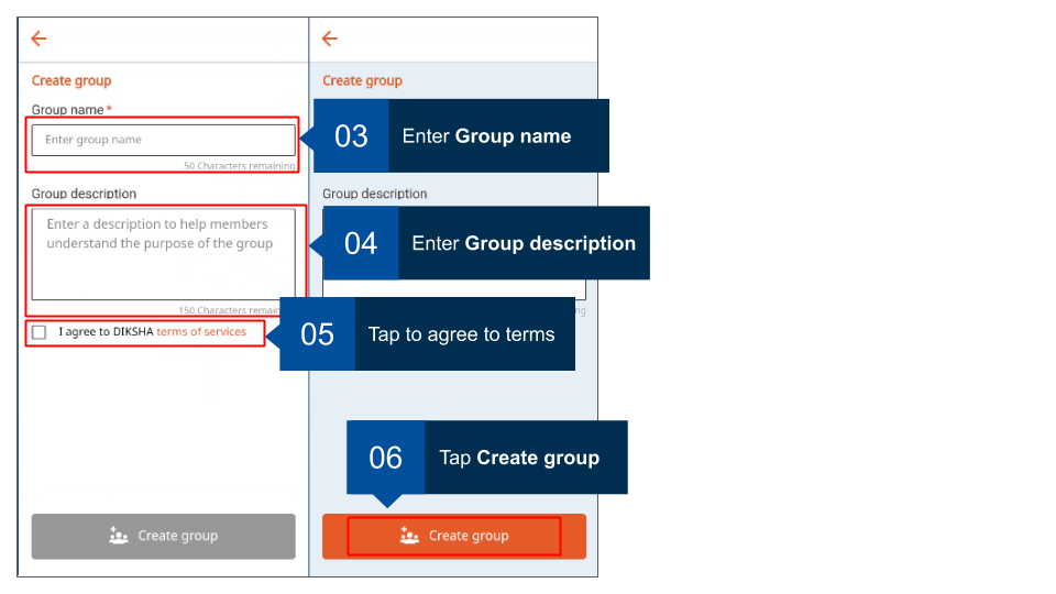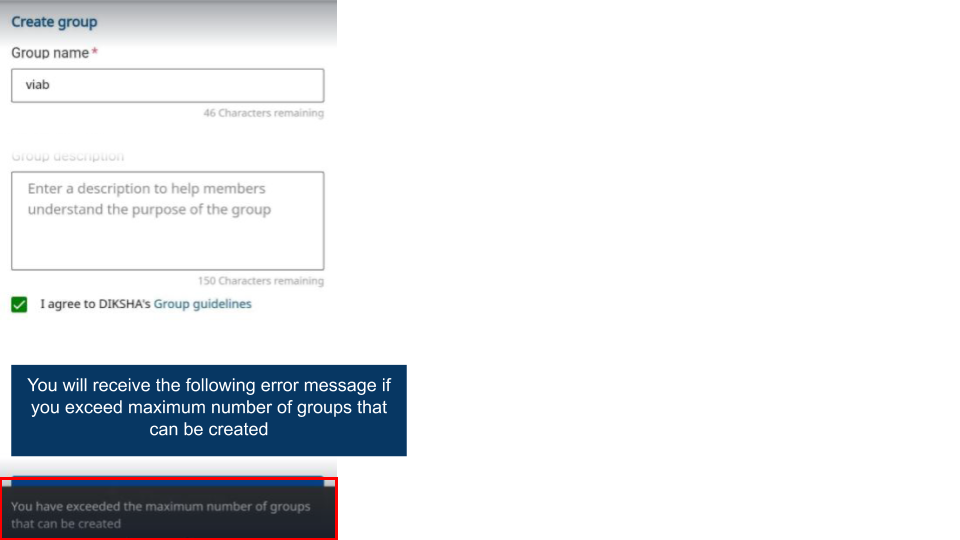 Note: It is mandatory to accept DIKSHA’s terms of use to create a group. An error message is displayed when trying to create a group without accepting the terms of use.
