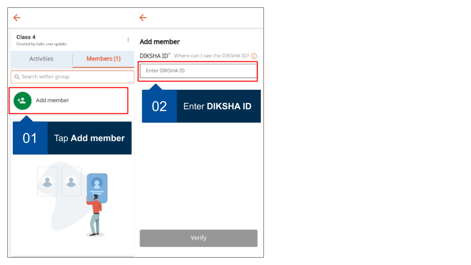 As a group administrator, you can add members to your groups. Ensure you have the valid DIKSHA ID of all users that you would like to add as members.
