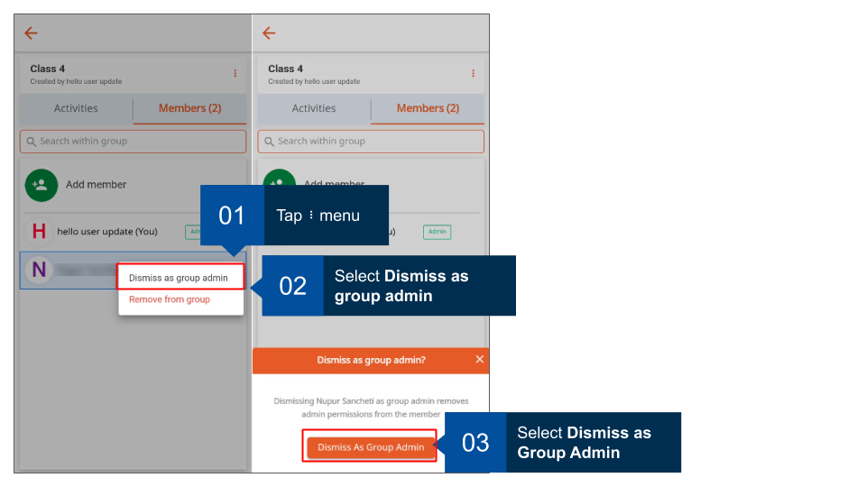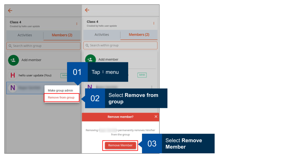 Group administrators can remove members from the group.