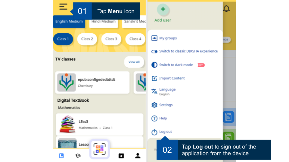 The DIKSHA app supports multiple users on the same device. Before you login with any other credentials on the device ensure you log out from your current account and the subsequent session. To protect any unauthorised access to your account on DIKSHA app, you must log out from DIKSHA mobile app on a device.