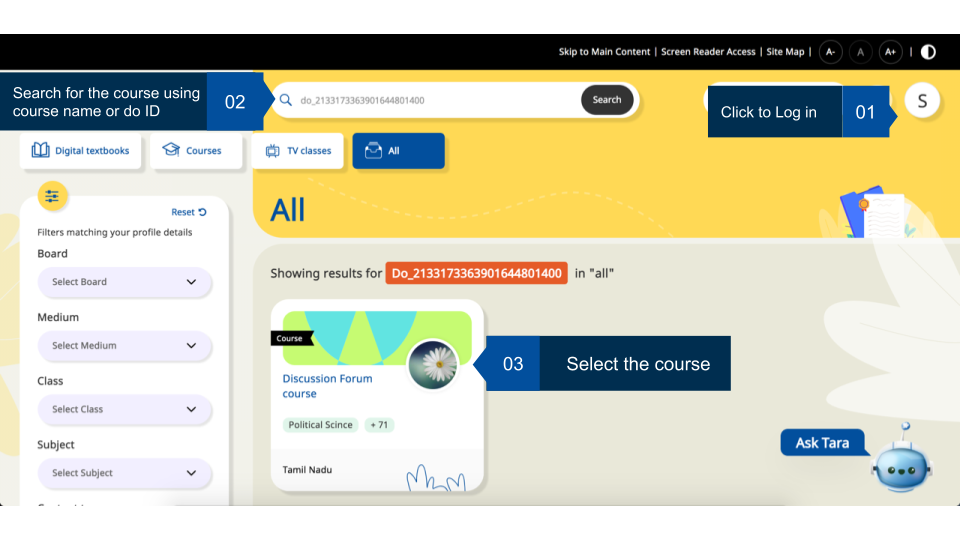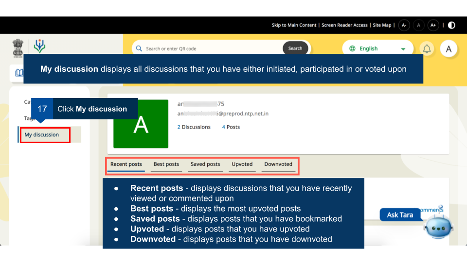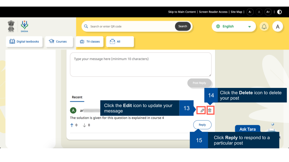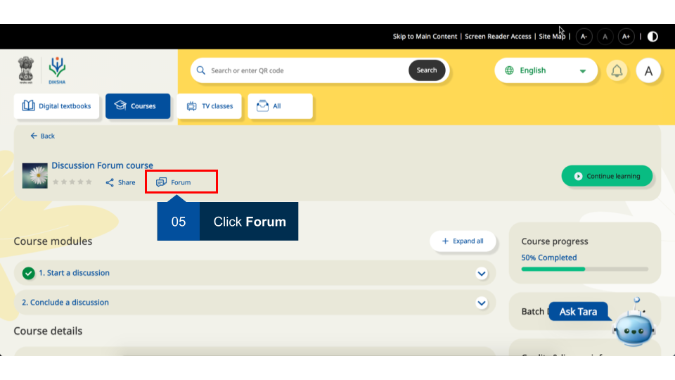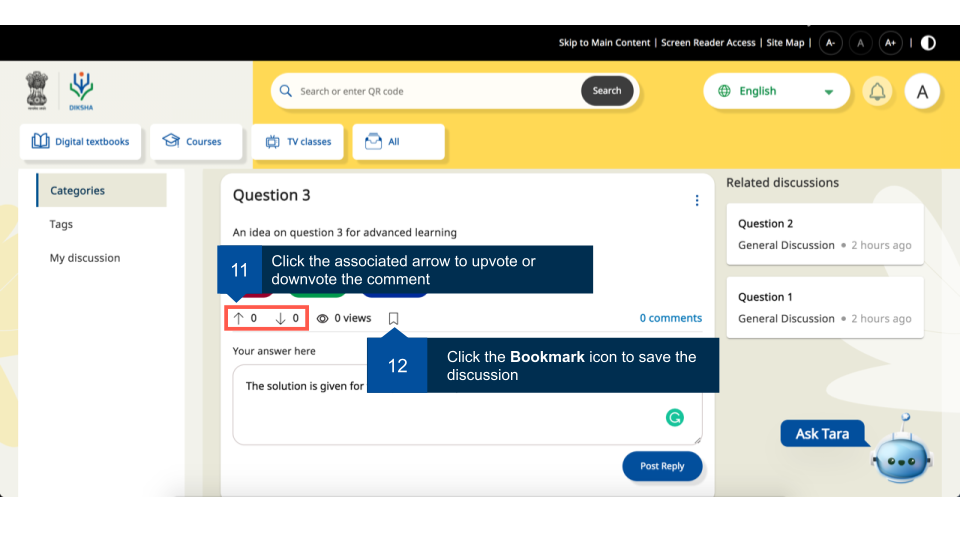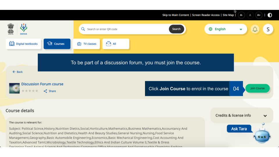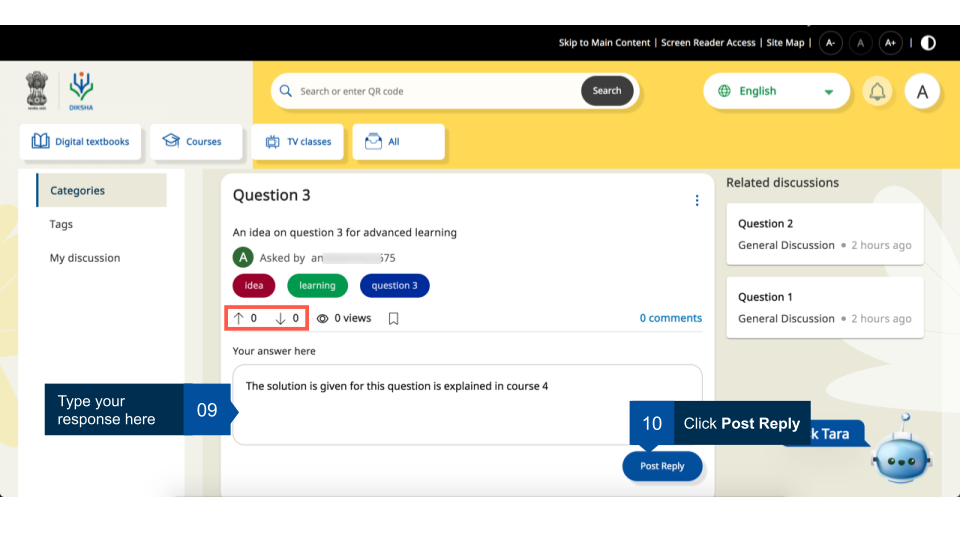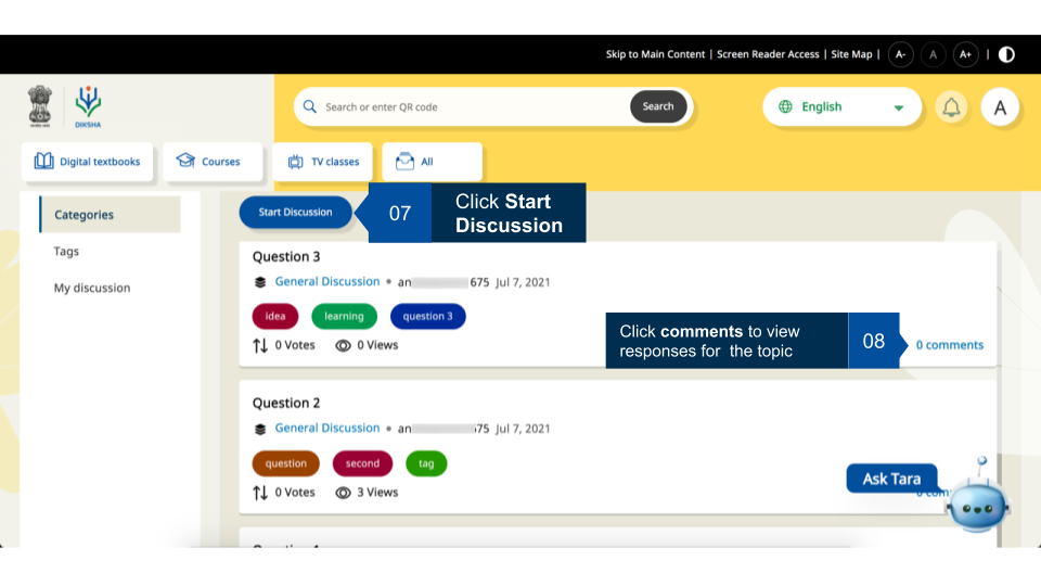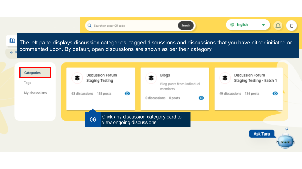 Registered users can join any available batch of a course. These courses may have discussion forums enabled by the course creator. User can view discussions around different categories, tag them with appropriate label for increasing their searchability, and the discussion started by them or any comments they have made.