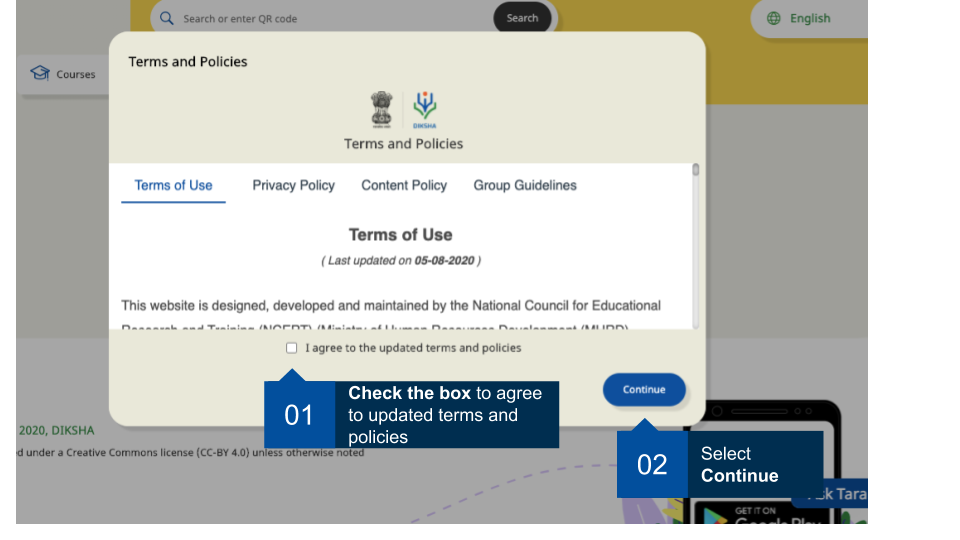 | Before starting the chosen course, the user needs to agree to the terms and policies of DIKSHA. The 'Continue' button on the pop-up is enabled only after the user checks the box. The user cannot exit the pop-up without agreeing. |