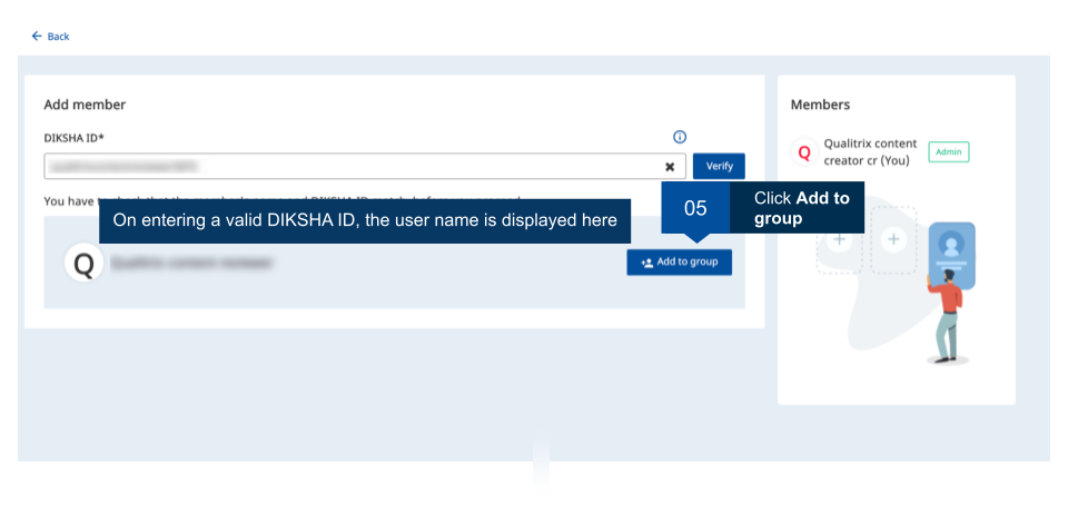 As a group administrator, you can add members to your groups. A maximun of 50 members can be added to a group. Ensure you have the valid DIKSHA ID of all users that you would like to add as members. This page provides step-by-step instruction on how to add members to a group