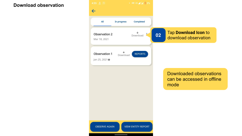 Users can download an observation to be filled offline. The observation can be saved offline and submitted when an internet connection is available. Downloaded observations can be accessed using the Download tab in the bottom navigation panel of DIKSHA app.