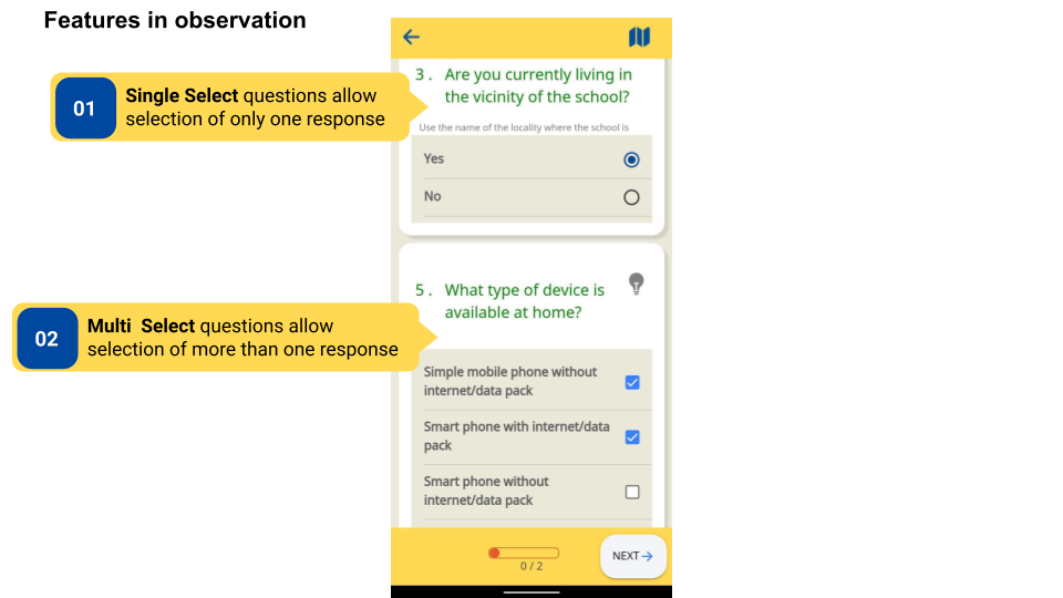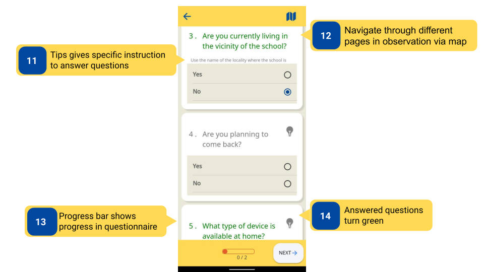 An observation questionnaire has different kinds of questions and features that can be used to navigate through the questionnaire.