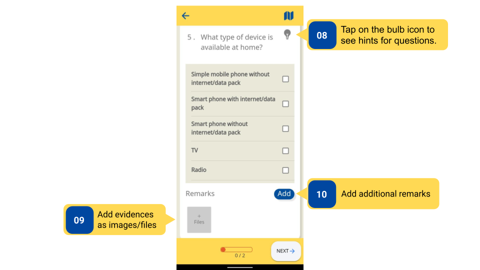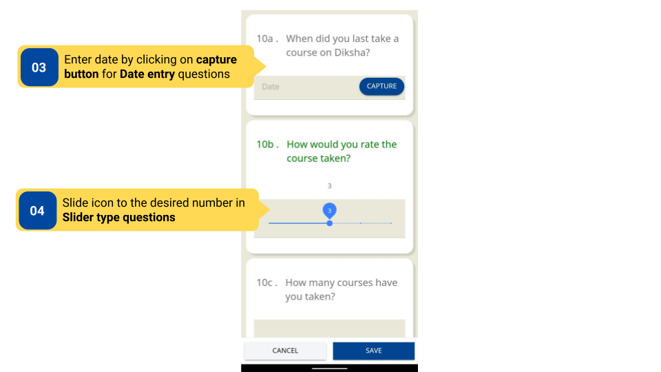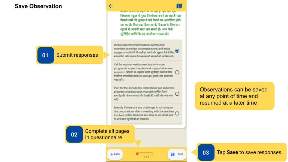 Observations can be saved before submitting to save the progress of responses filled. Users can come back to saved responses at any point before submitting the observation.