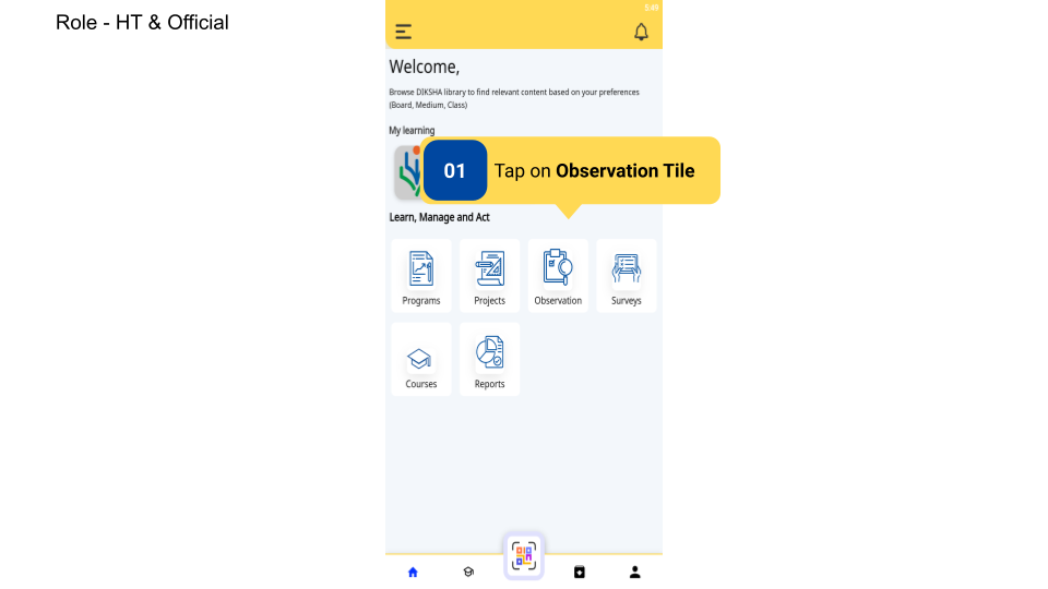 The observation tile is available only if it has been enabled for your board. To enable Observation, send the request DIKSHA Support Team.